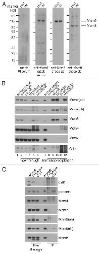 Figure 2. Mcm8 and Mcm9 form a dimer. (A) Interphase extract was separated through Superose 6 gel filtration column and fractions analyzed by western blotting with the indicated antibodies. Molecular mass and Stokes radius of marker proteins used for column calibration are indicated above the blots. (B) Interphase extract was separated by 20–40% glycerol gradient centrifugation and fractions analyzed by western blotting with the indicated antibodies. Molecular mass and sedimentation coefficients of marker proteins used to calibrate the gradient are indicated above the blots. (C) Stokes radiuses and sedimentation coefficients of indicated proteins were used to calculate the molecular sizes of native complexes.