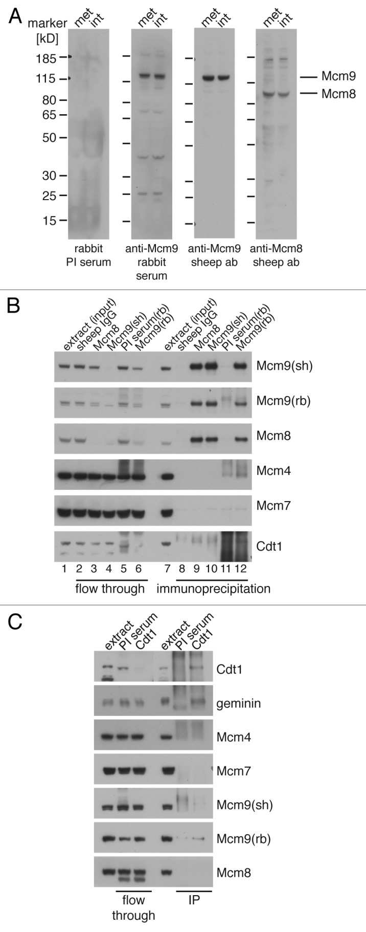 Figure 1. Mcm8 and Mcm9 form a complex in egg extract. (A) Western blot of 0.5 µl of Xenopus interphase and metaphase arrested extracts with preimmune and Mcm9-specific rabbit serum or sheep affinity purified antibodies anainst Mcm8 and Mcm9. (B) Mcm8 and Mcm9 were immunoprecipitated from egg extract using rabbit (rb) and sheep (sh) antibodies. Commercial sheep IgG and rabbit pre-immune serum (PI) were used as control. Input (extract), depleted input (flow through) and immunoprecipitation samples were analyzed by western blotting with indicated antibodies. (C) Cdt1 was immunoprecipitated from interphase egg extract. Immunoprecipitated samples were analyzed as in (B).