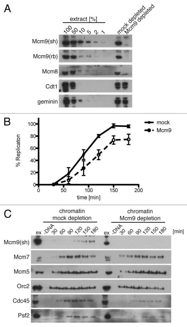 Figure 4. Mcm9 is required for efficient DNA replication but not Mcm2–7 loading. Egg extract prior to depletion was diluted and the indicated percentage of original extract volume analyzed by western blotting with the indicated antibodies alongside samples of control and Mcm9-depleted extracts. (B) Control-depleted and Mcm9-depleted extract were supplemented with sperm nuclei at 7.5 ng DNA/µl and α-[32P]dATP. At the indicated times, aliquots were taken, and DNA synthesis assessed by TCA precipitation and scintillation counting. The mean value with the standard error of the mean (SEM) are plotted in three sets of independently depleted mock and Mcm9-depleted extracts normalized to the maximum DNA synthesis observed in each control-depleted extract. (C) Control-depleted and Mcm9-depleted extracts were supplemented with sperm nuclei at 7.5 ng DNA/µl. Chromatin was isolated at the indicated times and immunoblotted with the indicated antibodies. A representative of three performed experiment is presented.