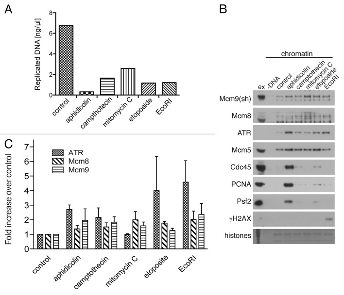 Figure 5. Mcm8 and Mcm9 bind chromatin at higher level after DNA damage. Sperm nuclei were incubated at 10 ng DNA/µl in interphase egg extract, and after 30 min, aliquots were supplemented with the indicated DNA damaging agents. (A) Extract was also supplemented with α-[32P]dATP at 30 min, and the total DNA synthesized at 90 min was determined. (B) Chromatin was isolated at 90 min after sperm DNA addition and immunoblotted with the indicated antibodies. (C) The intensity of the Mcm8, Mcm9 and ATR bands were quantified in immunoblots from three independent experiments, normalized to the quantity of histone loaded and the mean fold of increased chromatin binding of indicated proteins was determined for all tested DNA replication inhibitors. Standard error of the mean is also presented.