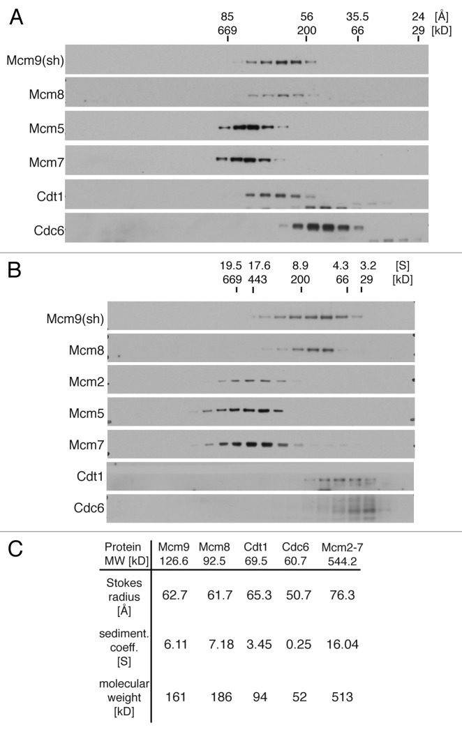Figure 2. Mcm8 and Mcm9 form a dimer. (A) Interphase extract was separated through Superose 6 gel filtration column and fractions analyzed by western blotting with the indicated antibodies. Molecular mass and Stokes radius of marker proteins used for column calibration are indicated above the blots. (B) Interphase extract was separated by 20â40% glycerol gradient centrifugation and fractions analyzed by western blotting with the indicated antibodies. Molecular mass and sedimentation coefficients of marker proteins used to calibrate the gradient are indicated above the blots. (C) Stokes radiuses and sedimentation coefficients of indicated proteins were used to calculate the molecular sizes of native complexes.