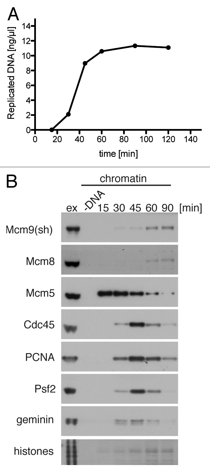 Figure 3. Mcm8 and Mcm9 bind chromatin at the late stages of DNA replication. Sperm nuclei were incubated at 10 ng DNA/µl in interphase egg extract. (A) Extract was supplemented with α-[32P]dATP. At the indicated times DNA synthesis was assessed by TCA precipitation and scintillation counting. (B) Chromatin was isolated from 10 µl aliquots at the indicted times and immunoblotted alongside 0.5 µl of egg extract with the indicated antibodies. Chromatin isolation of a sample without addition of sperm DNA was performed as a control for chromatin specificity of the assay.