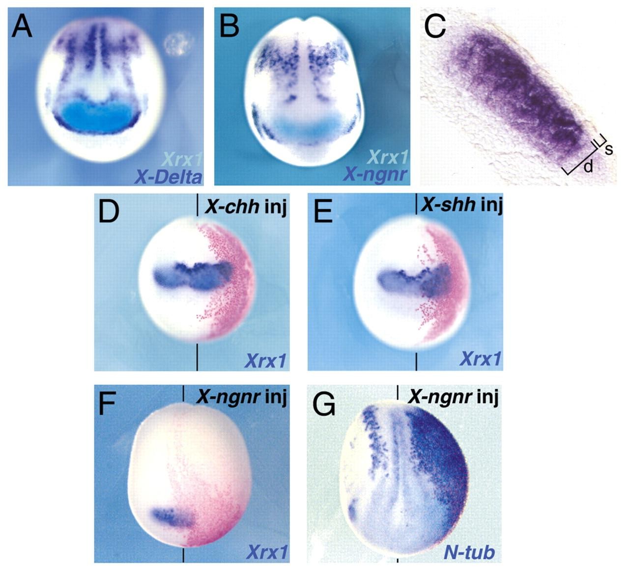 Fig. 1. Xrx1 expression in the proliferative region of the anterior neural plate is controlled by Hedgehog and neurogenin signaling. (A,B) Expression of Xrx1 (light blue) in relation to the expression of (A) X-Delta-1 (purple) and (B) X-ngnr-1 (purple) in stage 13 embryos; frontodorsal views. (C) Sagittal section of a stage 13 embryo showing Xrx1 expression in the deep sensorial layer of the neuroectoderm. (D,E) Stage 14 embryos injected with X-chh (D) and X-shh (E) showing ectopic expression of Xrx1 (blue); frontal views, dorsal towards the top. (F,G) Embryos injected with X-ngnr-1 displaying repression of Xrx1 (blue, F, stage 13) and ectopic expression of N-tubulin (blue, G, stage 16); frontodorsal views. The injected side of the embryos (to the right of vertical bars representing the midline) is indicated (inj). Red staining represents expression of co-injected lacZ lineage tracer. d, deep neuroectodermal layer; s, superficial neuroectodermal layer.