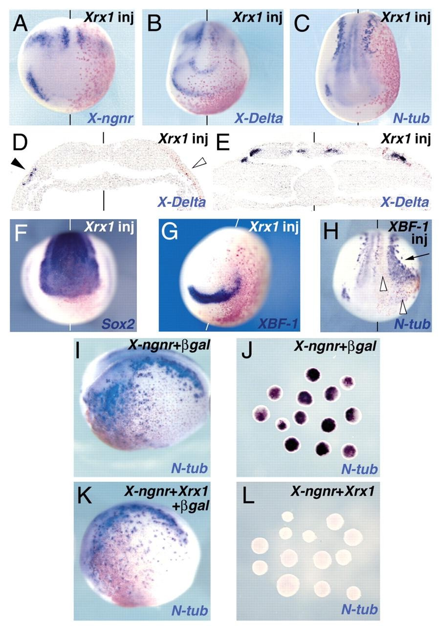 Fig. 2. Xrx1 inhibits neurogenesis. The effects of Xrx1 overexpression on (A) X-ngnr-1 (stage 12), (B,D,E) X-Delta-1 (stage 13), (C) N-tubulin (stage 16), (F) Sox2 (stage 13) and (G) XBF-1 (stage 13) are shown. (D,E) Transverse sections at the level of the anterior (D) and posterior (E) neural plate. The black arrowhead indicates the anterior expression domain of X-Delta-1, while the white arrowhead indicates the repression of the corresponding domain in the injected side. (H) Stage 16 embryo injected with 150 pg of XBF-1 RNA showing suppression of endogenous N-tubulin (white arrowheads) as well as ectopic N-tubulin activation at the border of the injected area (arrow). A-C,F,G,H Frontodorsal views. (I,K) Stage 16 embryos co-injected with either X-ngnr-1 and lacZ (I) or X-ngnr-1, Xrx1 and lacZ (K); lateral views, anterior towards the left. (J,L) Animal caps co-injected with either X-ngnr-1 and lacZ (J) or X-ngnr-1 and Xrx1 (L) analyzed at stage 16. Both in whole embryos and in animal caps Xrx1 inhibits N-tubulin expression induced by X-ngnr-1. Red staining represents expression of co-injected lacZ lineage tracer.