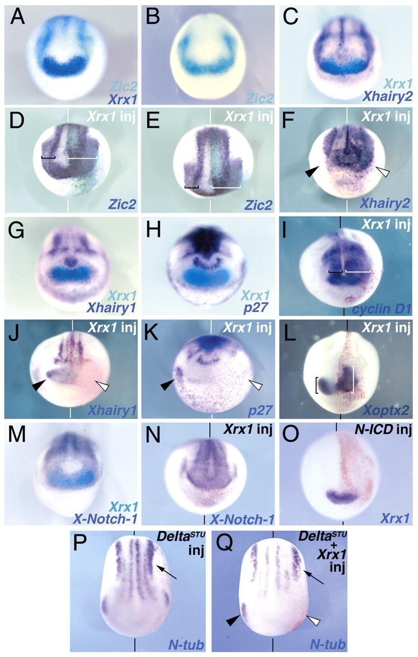Fig. 5. Xrx1 regulates the expression of genes that control cell proliferation and differentiation, and does not work through the Notch-Delta pathway at early neurula. (A-C,G,H,M) Comparison of the expression of Xrx1 to that of Zic2 (A,B), Xhairy2 (C), Xhairy1 (G), p27Xic1 (H) and X-Notch-1 (M) in stage 13 embryos. (D-F,I-L,N) Xrx1-injected embryos analyzed at stage 14 (D-F,J,K,N) or stage 18 (I,L). The probes used and the respective staining are indicated, color-coded, on the bottom of each panel. (A-D,F-O) Frontal views, dorsal towards the top; (E,P,Q) dorsoanterior views. The injected side of the embryos (to the right of vertical bars representing the midline) is indicated (inj). Red staining in F,I,J,K,L,N-Q and turquoise staining in D,E represent expression of co-injected lacZ lineage tracer. (F,J,K) Black arrowheads indicate the lateroventral expression domain of Xhairy2 (F), Xhairy1 (J) and p27Xic1 (K) in the uninjected control side of the embryos. White arrowheads indicate the corresponding expression domain in the injected side, which is expanded in the case of Xhairy2 (F) and repressed in the case of Xhairy1 (J) and p27Xic1 (K). Black brackets indicate the anterior expression domains of Zic2 (D,E), cyclinD1 (I) and Xoptx2 (L) in the control uninjected side; white brackets indicate the corresponding enlarged domains in the injected side. (O) Stage 14 embryo injected with Notch-ICD showing no significant change in Xrx1 expression. (P,Q) Stage 16 embryos injected with X-Delta-1stu and lacZ (P) or co-injected with Xrx1, X-Delta-1stu and lacZ (Q). Xrx1 represses N-tubulin expression in the trigeminal ganglion but does not affect N-tubulin posterior expansion. Arrows indicate the increase in density of N-tubulin-positive cells within the posterior neurogenic stripes caused by the block of lateral inhibition. The black arrowhead indicates N-tubulin expression in the trigeminal ganglion of the uninjected side; the white arrowhead indicates the absence of this expression domain in the injected side.