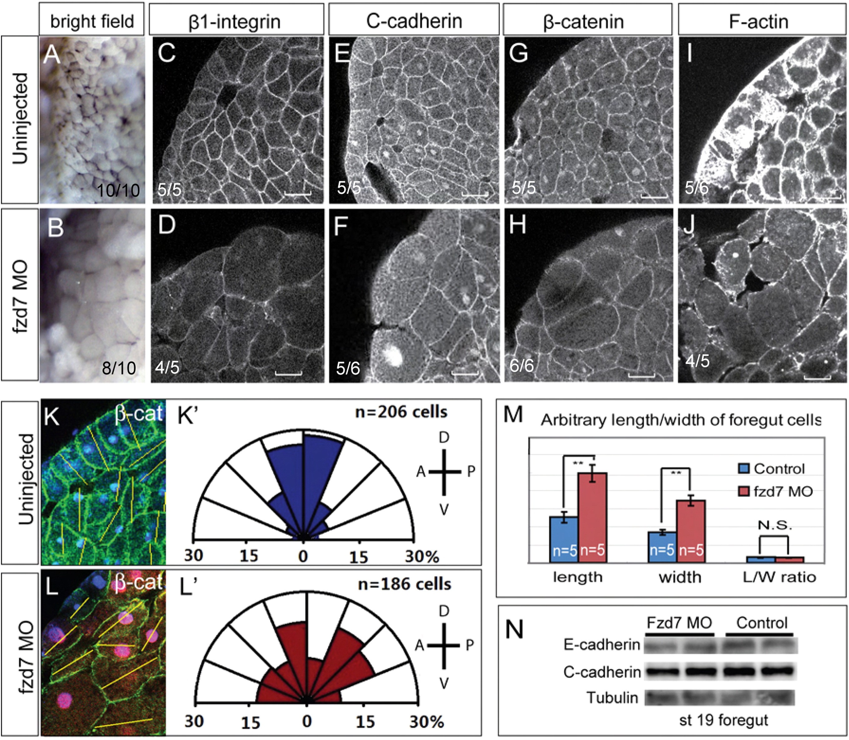 Fig. 3. Fzd7-depletion causes defects in foregut cell morphology. (A,B) Bight field view of the foregut surface at stage 20 showed that Fzd7 morphants exhibit larger loosely adherent cells (B), compared to controls (A). (C) Confocal immunostaining of the foregut (anterior left, dorsal up) with β1-integrin (C,D), C-cadherin (E,F), β-catenin (G,H) and phalloidin (F-actin) (I,J) showed decreased cell adhesion molecules and reduced cytoskeleton in the enlarged foregut cells of Fzd7 morphants. All of the images were taken using same setting for control and fzd7-MO embryos. (K,L) Quantitation of cell size and orientation; foregut cell length, width and orientation in control (K) and fzd7- MO injected embryos (L) were measured from β-catenin immunostaining (green) using Image-J. Nuclei shown in blue, fzd7-MO/RLDx in red. All images were oriented with dorsal up. The yellow line marks the long axis of foregut cells, and quantification shows the frequency of orientations of the long axis of cells in Fzd7 morphants (L,L') and control (K,K') n1⁄4 the total number of foregut cells from 5 uninjected (K') and 5 fzd7-MO embryos (L' ). (M) The relative length, width, and length/width radio in control and Fzd7-depleted foregut cells.**po0.01 relative to controls in Student's t-test. (N) Western blot analysis shows no significant changes of total E-cadherin and C-cadherin level in the foregut explants. |