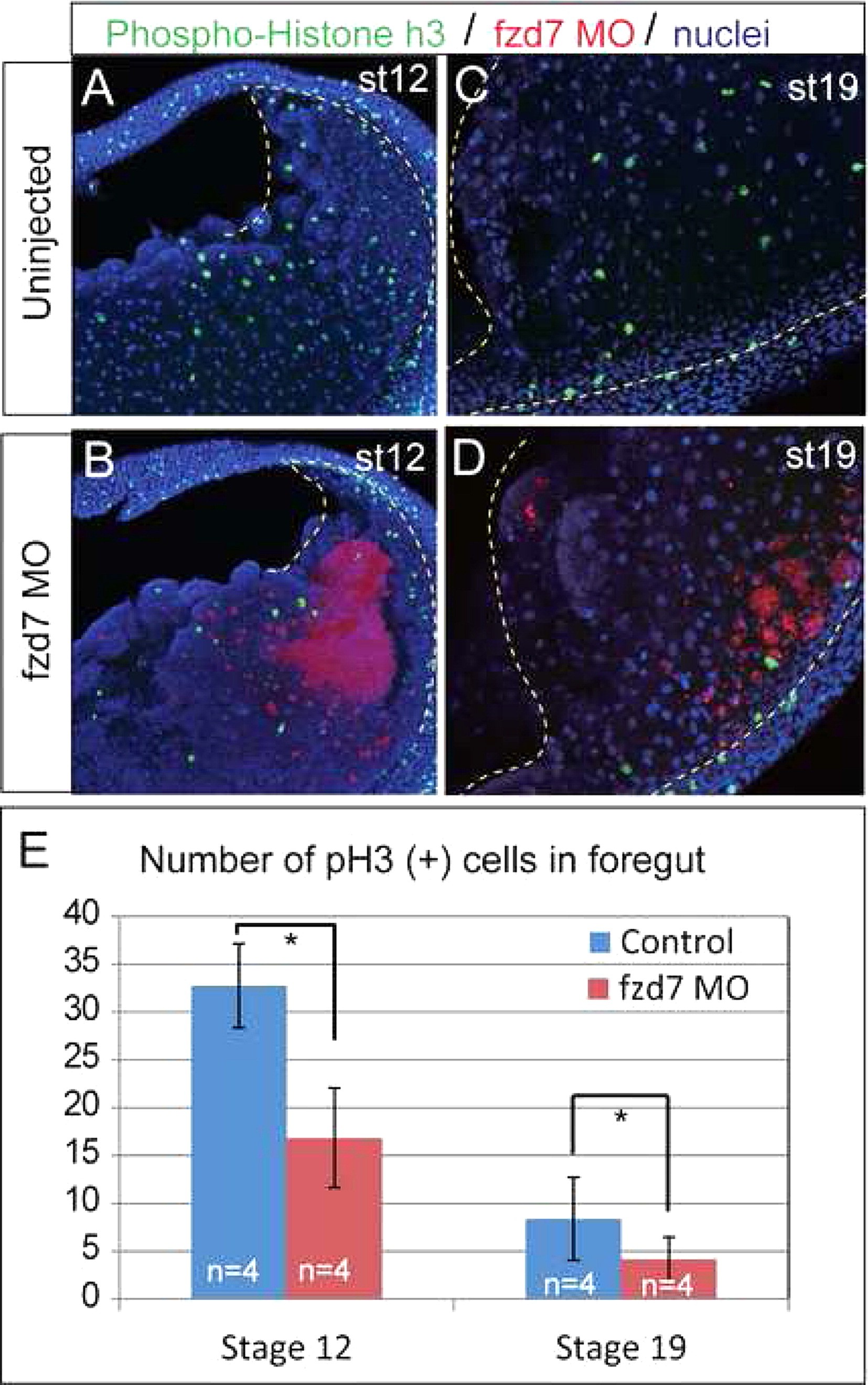 Fig. 4. Fzd7-depletion causes reduced cell proliferation. (A) Confocal immunos- taining of phospho-Histone h3 (PH3; green), nuclei (blue) and fzd7-MO/RLDx (red) at stage 12 (A,B) and stage 19 (C,D) show that Fzd7-depleted embryos exhibit reduced foregut (outlined in dashed yellow line) proliferation. (E) Mean number of PH3 positive cells in the foregut 7S.D. *po0.05 relative to sibling controls in Student's t-test (n1⁄44 embryos/ condition). |