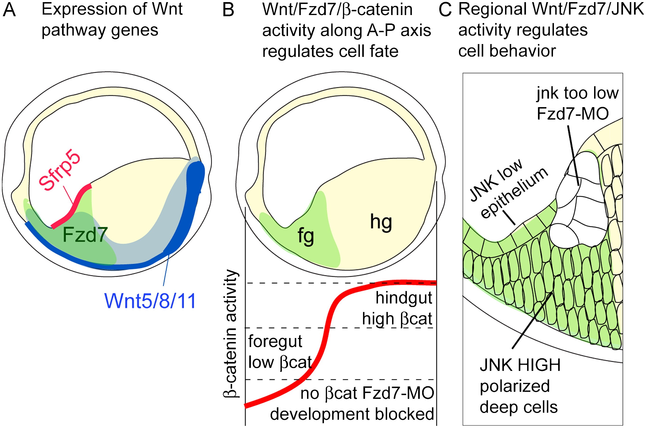 Fig. 8. A model of how Wnt/Fzd7/Sfrp5 regulate β-catenin and JNK signaling to coordinate endoderm fate, morphogenesis. (A) Schematic of a neurula embryo (anterior left) showing expression of the fzd7 (green), wnt11, wnt5 and wnt8 in the ventral mesoderm and endoderm (blue) and the Wnt-antagonist sfrp5 in the surface of the foregut endoderm (red). The spatial expression pattern of receptors, ligands and antagonists is postulated to establish differential Wnt activity in the endoderm. (B) Different thresholds of β-catenin/TCF activity (red line) pattern endoderm with high activity promoting hindgut progenitor fate (hg), where as a low but essential level of β-catenin/ TCF is required to maintain foregut (fg) fate. (C) Differential Fzd7/JNK activity might regulate cell shape, adhesion and morphogenesis in the foregut (green). Fzd7/JNK signaling in the deep endoderm promotes cell adhesion and the oriented cell shape required for gut elongation. Sfrp5 in the surface layer reduces JNK activity to a low but essential level to establish an epithelium. If JNK activity is too low (as in Fzd7 morphants) cells become enlarged, loosely adherent with a random orientation. |