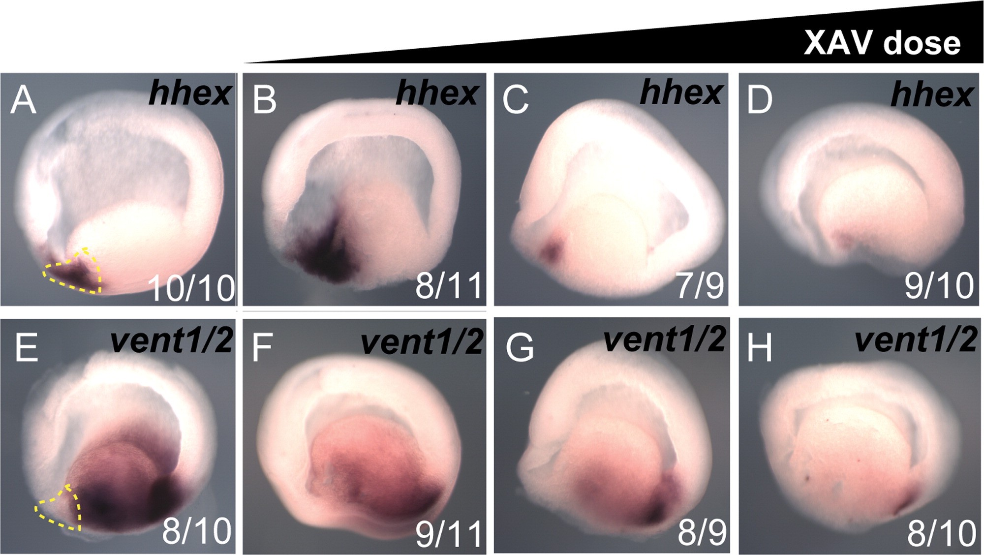 Figure S2. Wnt signaling has different thresholds in the endoderm. (A-H) Embryos were treated with the following doses of XAV-939 to promote β-catenin degradation: DMSO vehicle (A,E), 10 μM (B,F), 30 μM (C,G), 80 μM (D,H). In situ hybridization to stage 19 bisected embryos showed that low doses of XAV-939 expanded the hhex expression domain (yellow dashed line) (B) at the expense of hindgut markers vent1 and vent2 (a mixture of both probes referred to as vent1/2) (F). The highest dose of XAV-939 resulted in a loss of hhex and vent1/2 (C,D,G, H). The number of embryos with the illustrated phenotype is indicated in each panel. |