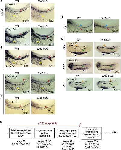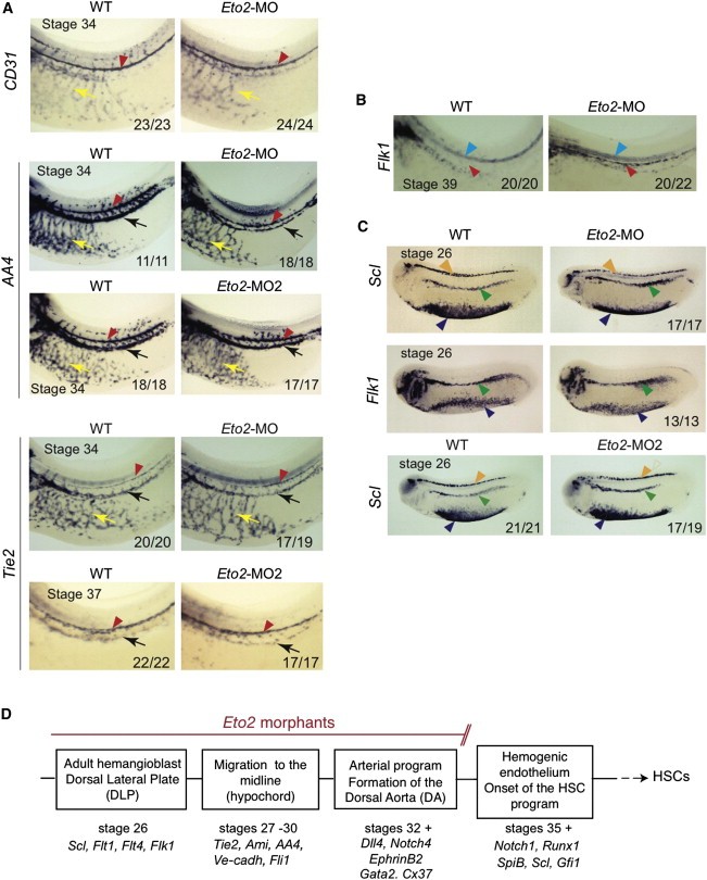 Figure 3. The Major Axial Vessels Are Normal and Adult Hemangioblasts Are Specified in ETO2 Morphants(A) The endothelial markers CD31, AA4, and Tie2 are expressed normally in the axial vessels of Eto2 morphants (Eto2-MO and Eto2-MO2), revealing the DA (red arrowhead), the PCV (black arrow), and the trunk vasculature (yellow arrow).(B) Abnormal expression of Flk1 in Eto2 morphant DA at stage 39 (red arrowhead), as a consequence of the absence of Notch1. Blue arrowhead: notochord.(C) Specification of adult hemangioblasts is unaffected in ETO2-deficient embryos. Scl is expressed normally at stages 26 in the DLP, primitive erythroid cells, and neurons in Eto2 morphants (Eto2-MO and Eto2-MO2, green, blue, and orange arrowheads, respectively). Flk1 is also expressed normally in the DLP and trunk endothelium of Eto2 morphants (green and blue arrowheads, respectively).Numbers in the bottom right of the panels denote the number of embryos as shown in the panel out of the total examined. Whole mounts are shown with anterior to the left and dorsal to the top. Sections are in transverse orientation with dorsal to the top.(D) Schematic diagram depicting the succession of events leading to HSC specification and the requirement for ETO2. The earliest defect in Eto2 morphants is the loss of Notch1 expression. Molecular markers analyzed in this study are indicated for each stage of development shown.See also Figures S2BâS2D and S4. |