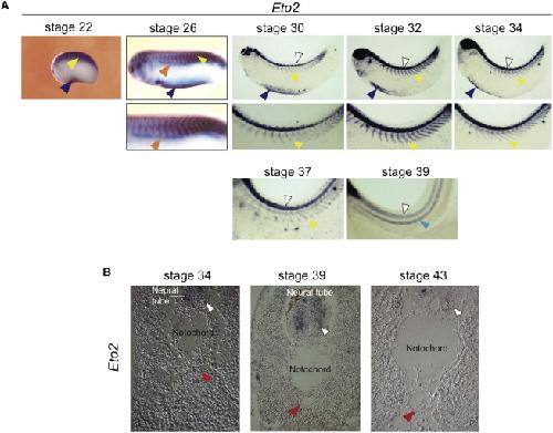 Figure 4. Eto2 Is Expressed in Precursors of Primitive but Not Definitive Blood(A) Eto2 expression (WMISH) from stage 22 to stage 39. Eto2 is found in somitic tissues (yellow arrowheads), the developing VBI (dark blue arrowheads, up to stage 34), and, from stage 30, the neural tube (white arrowheads). At stage 26, no expression was detected in the DLP, delineated by Lmo2 expression (orange arrowhead). Light blue arrowhead, notochord.(B) Eto2 expression (ISHS) was not seen in the DA (red arrowheads, stages 34â43).Whole mounts are shown with anterior to the left and dorsal to the top. Sections are in transverse orientation with dorsal to the top. See also Figures S3 and S4. |