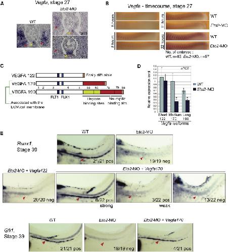 Figure 5. ETO2 Regulates HSC Development through VEGFA170(A) Vegfa expression is downregulated (top right panel) or absent (bottom right panel) in the somites of stage 27 Eto2 morphants (red arrowheads) but maintained in the hypochord (yellow arrowheads), as revealed by ISHS (transverse sections with dorsal to the top).(B) WMISH staining time course reveals downregulation of Vegfa in Eto2 morphant somites; the staining is markedly lighter in morphant embryos at 8 and 11 hr after addition of the staining substrate (anterior to the left, dorsal to the top).(C) Alternative splicing generates VEGFA isoforms with different biological properties. In X. laevis, there are three known VEGFA isoforms (VEGF122, VEGFA170, and VEGFA190). FLK1, FLT1: binding domains for receptors. The C-terminal domain of isoforms VEGFA170 and VEGFA190 is responsible for association with the extracellular matrix (ECM) and the cell membrane. VEGF122 is the diffusible isoform (Cleaver and Krieg, 1998).(D) Levels of isoform-specific VEGFA transcripts in WT and Eto2 morphant somite-hypochord regions at stage 27 (n = 5) quantitated by qPCR. Error bars denote SEM. âp < 0.05.(E) Exogenous Vegfa170 expression rescues the HSC program in Eto2 morphants. Embryos were coinjected with Eto2-MO only or Eto2-MO and 4 ng of mRNAs encoding Vegfa122or Vegfa170 isoforms. Rescue of Runx1 and Gfi1 expression in DA (WMISH, red arrowheads) was observed only with Vegfa170 mRNA. Pos, positive; neg, negative. Whole mounts are shown with anterior to the left; dorsal at the top.See also Figure S5. |