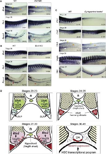 Figure 7. No Epistasis between ETO2, ETV6, and Hedgehog Signaling(AâC) Expression analysis by WMISH of Etv6, Eto2, Ptc1, Vegfa, and Dll4 in Eto2 (A) and Etv6 (B) morphants as well as in embryos treated with cyclopamine (C). Efficiency of Eto2 and Etv6 morpholinos is controlled by Runx1 staining at stage 39, and that of cyclopamine is controlled by Ptc1 staining. Red arrowheads, DA; orange arrowheads, Etv6 staining in the somites; blue arrowheads, notochord; yellow arrowheads, neural tube; white arrowheads, DLP. Numbers at the bottom of the panels indicate the number of embryos with the given phenotype out of the total number examined. Whole mounts are shown with anterior to the left and dorsal to the top.(D) Uncoupling the requirement for VEGFA isoforms during HSC development in Xenopus. Schematic diagram depicting the requirements for VEGFA isoforms in the succession of events leading to HSC formation. Stages 20â23: ETV6 regulates production of VegfA in the somites, VegfA short isoform is critical for correct programming of the adult hemangioblasts in the DLP (green arrows). Stages 24â26: the adult hemangioblasts (or DA precursors) express both endothelial (Flk1) and hematopoietic (Scl) markers and Vegfa in an autocrine manner. The hypochord secretes VegfA short isoform that guides migration of hemangioblasts to the midline (green arrows). Stages 27â30: ETO2 regulates production of VegfA long/medium isoforms (VegfA M/L) in the somites. These isoforms instruct the hematopoietic program of the DA precursors as they migrate along the somites (red arrowheads). Stages 36â41: the DA has formed and is specified as an artery. Cells in the hemogenic endothelium express NOTCH1; this will trigger expression of the HSC transcriptional program. n, notochord. |