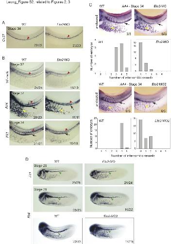 Figure S2. Analysis of arteriogenesis and vasculogenesis in Eto2-MO and Eto2-MO2 injected embryos, related to Figures 2, 3. Expression analysis of the arterial marker Cx37 (A, stage 34), the endothelial genes VE-cadh, Ami, Fli1 and AA4 (B-C, stages 37/34), Flt1 and Flt4 (D, stage 26) in Eto2-MO and Eto2-MO2 morphants. Red arrowhead, DA; black arrow, PCV; yellow arrow, trunk vasculature; green arrowhead, DLP. (C) Uncleared embryos, bracket indicates intersomitic vessels (ISVs) sprouting from the PCV in wild-type embryos; the graphs show the number of ISVs observed in wild-type, Eto2-MO and Eto2-MO2 embryos. Numbers at the bottom of the panels indicate the number of embryos with the given phenotype out of the total number examined. Whole mounts are shown with anterior to the left, dorsal to the top. |