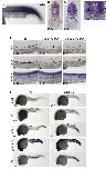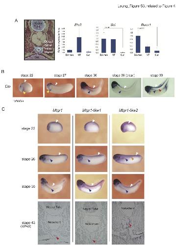 Figure S3. Eto2 is not expressed in the DA - Expression pattern of Eto2-related transcripts during development, related to Figure 4. Figure S3. Related to Figure 4. Eto2 is not expressed in the DA - Expression pattern of Eto2- related transcripts during development (A) Laser Capture Microdissection (LCM) was used to isolate specific tissues from stage 39 embryonic sections; the DA and surrounding mesenchyme (DA mes), the neural tube (NT) and gut. NT tissues were intended as a positive control for amplification of the Eto2 transcripts and the gut as a negative control (as expected from WMISH and ISHS results, Figure 4). Gene expression analysis was carried out for Eto2 and the known HSC markers Scl and Runx1 by Reverse Transcription Real Time PCR. Results were normalised to ODC. Errors bars represent the standard deviation from two independent experiments. Unlike the HSC markers, Eto2 expression in the DA mesenchyme is not significantly different from that observed in gut when compared to the high levels observed in the NT. (B, C) Expression of Eto, Mtgr1, Mtgr1-like1 and Mtgr1-like2 was examined during Xenopus development (B) Expression of Eto is detected in the heart fields (stage 22, yellow arrowhead), in the heart (stage 27, yellow arrowhead), in neural cells (stage 22; neural tube at stages 27, 36, 39, white arrowheads) and in the PCV (stages 36/39, blue arrowhead). There was no expression in the DA at stage 39 (red arrowhead). (C) Expression of Mtgr1, Mtgr1-like1 and Mtgr1-like2 is observed in neural cells (white arrowheads stage 22; neural tube at stages 26 and 35), and in the PCV (initiates anteriorly at stage 26, is established by stage 35; blue arrowheads). Mtgr1-like2 is expressed at low levels in the somites (stage 26, orange arrowhead). ISHS at stage 43 shows no expression of Mtgr1 and Mtgr1-like1 in the DA (red arrowhead) and a faint staining for Mtgr-like2 in the region of the DA and surrounding mesenchyme. However, given the lack of homology in the sequences targeted by the Eto2 MOs, it is highly unlikely that expression of Mtgr-like2 was affected in the knock-down experiments. Whole mounts are shown with anterior to the left and dorsal to the top. Sections are in transverse orientation with dorsal to the top. |