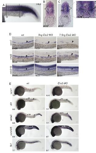 Figure S4. Zebrafish ETO2 is required for HSC emergence, related to Figures 1-4. The zebrafish studies provide an independent confirmation of the phenotype observed in Xenopus. Figure S4, related to Figures 1-4. Zebrafish ETO2 is required for HSC emergence (A-C) As in Xenopus, Eto2 is expressed in the trunk somites (A) but not in the dorsal aorta (DA), as seen in transverse sections along the trunk (B, C), at 24hpf (hours post-fertilisation); s, somites; ICM, intermediate cell mass. (D) To test the function of ETO2 in hematopoietic development, we knocked- down its expression using a morpholino that targets the zebrafish Eto2 (Meier et al. 2006). A dose- dependent loss of the HSC markers runx1 and cmyb (another HSC marker (Murayama et al. 2006)) in the DA (black arrowheads) was observed with increasing amounts of Eto2 MO, at 28hpf. In contrast, expression of the arterial marker notch1b was unaffected. (E) At 28hpf, none of the arterial markers analysed (dll4, dlC, notch3/5; DA, black and white arrowheads (Lawson and Weinstein 2002; Nicoli et al. 2008; Rowlinson and Gering 2010)) was affected in Eto2 morphants, whereas runx1 expression was severely downregulated (red arrowheads). Flk1 expression is grossly normal in Eto2 morphants confirming normal endothelialisation. Therefore, down-regulation of Eto2 in zebrafish embryos leads to non cell-autonomous phenotypic defects that are very similar to those observed in Xenopus Eto2 morphant embryos. |