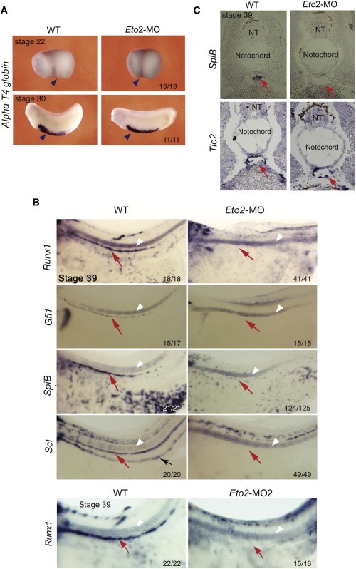Figure 1. ETO2 Is Necessary for the Onset of Definitive Hematopoiesis(A) Expression analysis showing no difference in expression of primitive erythroid gene alpha T4 globin at stages 22 and 30 in WT and Eto2 morphant embryos. Blue arrowheads, VBI.(B and C) ETO2 morphants show absence of expression of Runx1, Gfi1, SpiB, and Scl in the DA (red arrows) at stage 39. (B) Whole-mount in situ hybridization, WMISH. White arrowheads indicate the notochord. The black arrow (Scl panel, WT embryo) indicates the posterior cardinal vein (PCV) containing Scl-positive primitive erythrocytes. Staining is absent in the ETO2 morphants because circulation is delayed. (C) In situ hybridization on section (ISHS) for SpiB and the endothelial marker Tie2; note that the DA has formed and is lumenized in Eto2 morphants. NT, neural tube. Numbers in the bottom of the panels denote the number of embryos as shown in the panel out of the total examined. Whole mounts are shown with anterior to the left and dorsal to the top. Sections are in transverse orientation with dorsal to the top. See also Figures S1 and S4. |