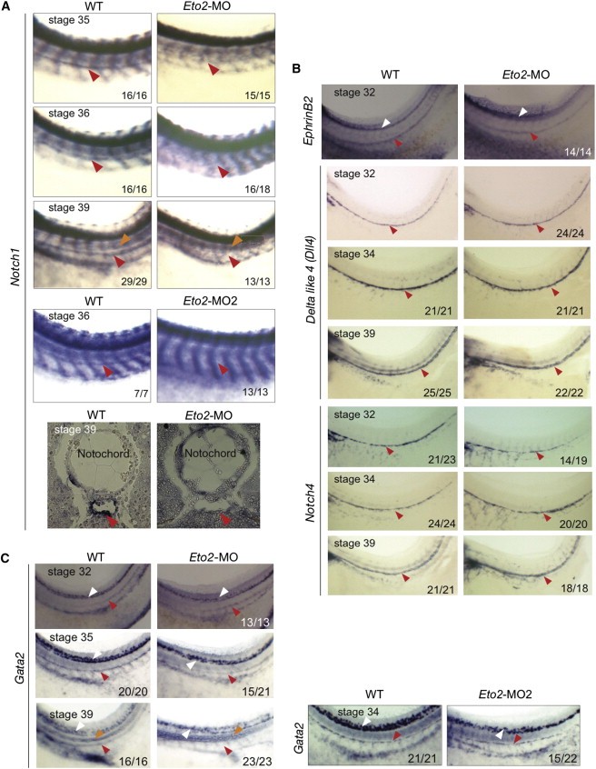 Figure 2. ETO2 Is Specifically Required for the Establishment of the Hematopoietic Program in the DA(A) Notch1 is absent in the DA of Eto2-MO and Eto2-MO2 morphants (stages 35/36/39, WMISH, and stage 39 bottom, ISHS; red arrowheads, DA; orange arrowheads, notochord).(B and C) Expression analysis of arterial-affiliated genes EphrinB2, Delta-like4 (Dll4), and Notch4 (B), as well as Gata2 (C) in the presumptive DA (stage 32) and in the DA (stages 34â39) in Eto2 morphants, red arrowheads. White and orange arrowheads: neural tube and notochord, respectively.Numbers in the bottom of the panels denote the number of embryos as shown in the panel out of the total examined. Whole mounts are shown with anterior to the left and dorsal to the top. Sections are in transverse orientation with dorsal to the top. See also Figures S2A and S4. |