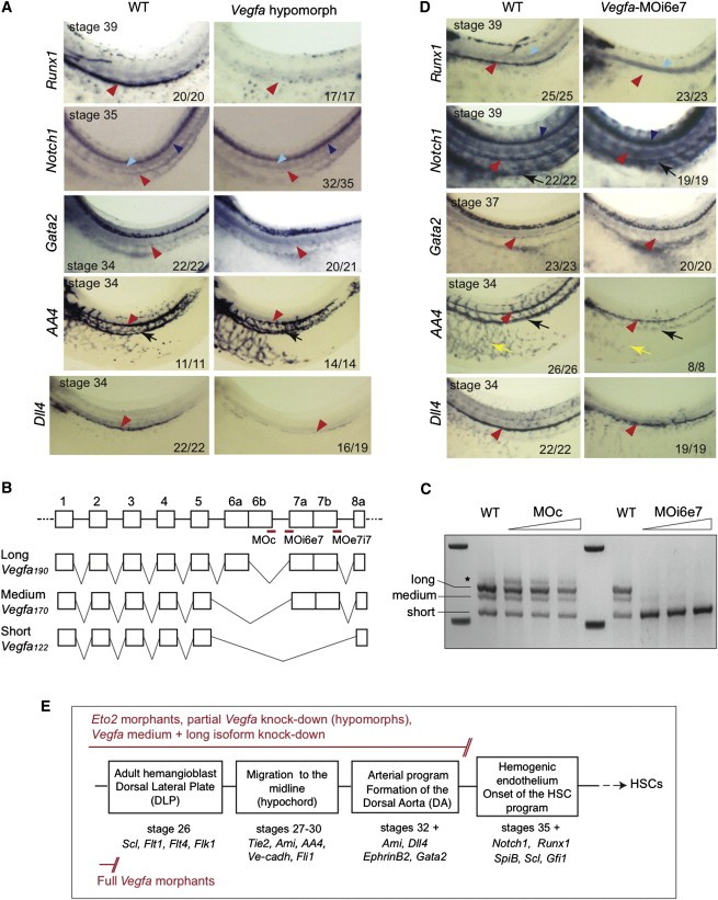 VEGFA signaling is critical for endothelial and hematopoietic stem cell (HSC) specification. However, blood defects resulting from perturbation of the VEGFA pathway are always accompanied by impaired vascular/arterial development. Because HSCs derive from arterial cells, it is unclear whether VEGFA directly contributes to HSC specification. This is an important question for our understanding of how HSCs are formed and for developing their production in vitro. Through knockdown of the regulator ETO2 in embryogenesis, we report a specific decrease in expression of medium/long Vegfa isoforms in somites. This leads to absence of Notch1 expression and failure of HSC specification in the dorsal aorta (DA), independently of vessel formation and arterial specification. Vegfa hypomorphs and isoform-specific (medium/long) morphants not only recapitulate this phenotype but also demonstrate that VEGFA short isoform is sufficient for DA development. Therefore, sequential, isoform-specific VEGFA signaling successively induces the endothelial, arterial, and HSC programs in the DA.