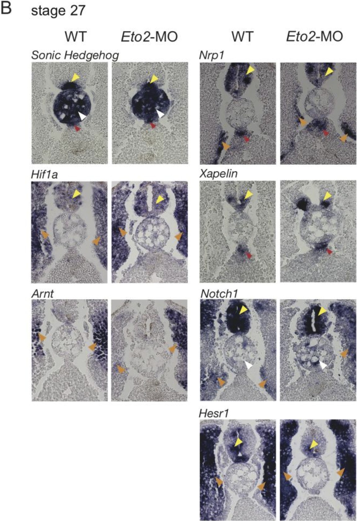 Figure S5.B Expression of a panel of markers implicated in the development of the DA/HSC progenitors in stage 27 WT and Eto2 morphant embryos, related to Figure 5. (also see S5A) (B) Expression of selected markers was examined in stage 27 WT and Eto2 morphant embryo sections by ISHS. There was no discernible alteration in the expression level or the pattern of these markers in the Eto2 morphants. Hypochord; red arrowheads, Neural tube; yellow arrowheads, Somites; orange arrowheads, Notochord; white arrowheads. Sections are in transverse orientation with dorsal to the top. |