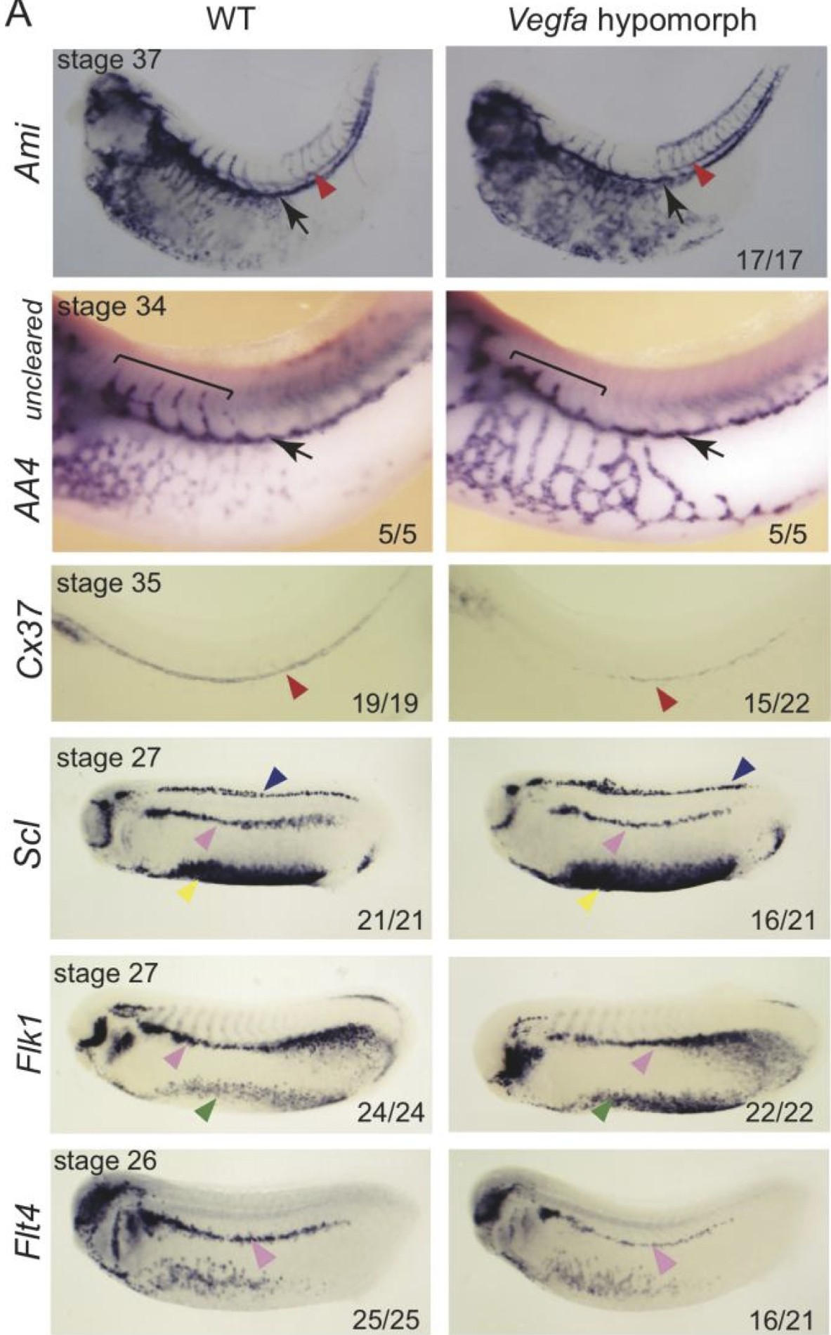 Figure S6.A Vegfa hypomorph embryos and Vegfa-MOi6e7 morphants phenocopy the Eto2 morphants, related to Figure 6. (A) Expression of endothelial (Ami, AA4, Flt4), arterial (Cx37) and hemangioblast (Scl and Flk1) genes was examined in Vegfa hypomorph embryos, by WMISH at the stages indicated. Note that AA4 expression was examined on uncleared embryos. |