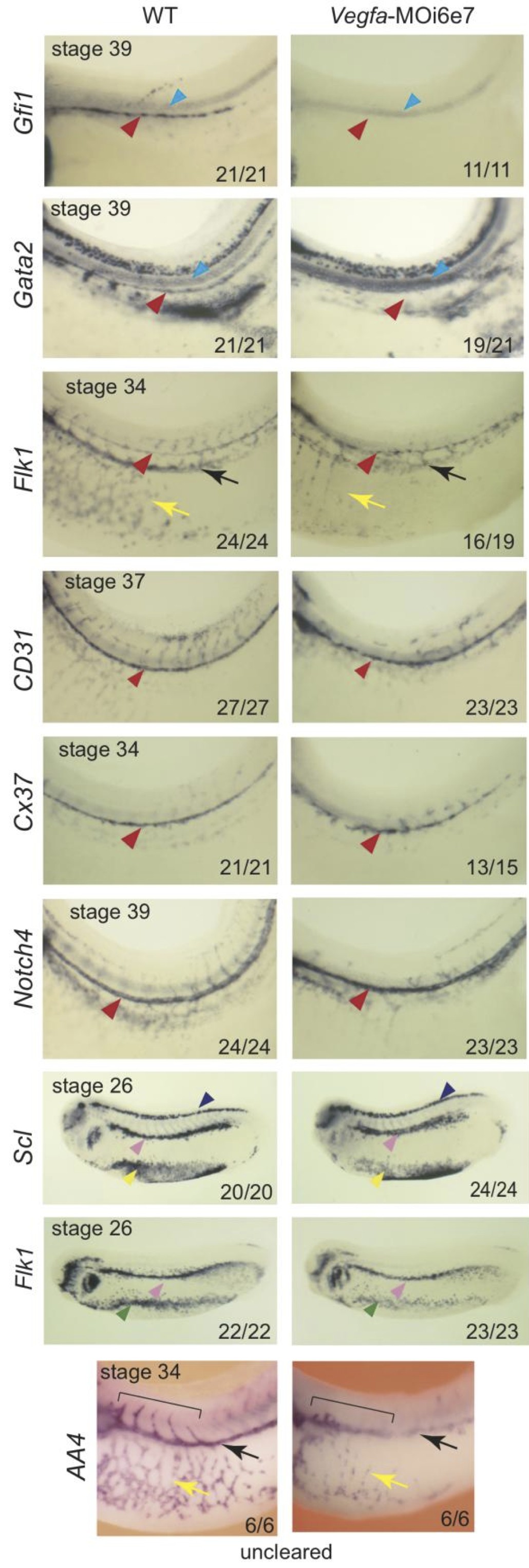 Figure S6.B. Vegfa hypomorph embryos and Vegfa-MOi6e7 morphants phenocopy the Eto2 morphants, related to Figure 6. (B) Vegfa medium/long isoform morphants (Vegfa-MOi6e7) recapitulate the Eto2 morphant phenotype in the DA. WMISH analysis of hematopoietic (Gfi1, Gata2) endothelial (Flk1, CD31), arterial (Cx37 and Notch4) and hemangioblast (Scl, Flk1) markers reveals that endothelialisation, arterialisation and hematopoietic specification do take place in the morphant DA (red arrowheads). Note, however, the absence of ISVs (AA4, uncleared embryos, brackets), the weak staining of the PCVs (black arrows) and the limited development of the trunk vasculature (yellow arrows) in the Vegfa-MOi6e7 morphants. Numbers at the bottom of the panels indicate the number of embryos with the given phenotype out of the total number examined. Whole mounts are shown with anterior to the left and dorsal to the top. Red arrowheads, DA; black arrows, PCV; brackets, ISVs; pink arrowheads, DLP; yellow arrowheads, VBI; dark blue arrowheads, Scl expression in the neural tube; green arrowheads, Flk1 expression in the trunk endothelium; light blue arrowheads, notochord; yellow arrows, trunk vasculature. Numbers at the bottom of the panels indicate the number of embryos with the given phenotype out of the total number examined. Whole mounts are shown with anterior to the left and dorsal to the top. |