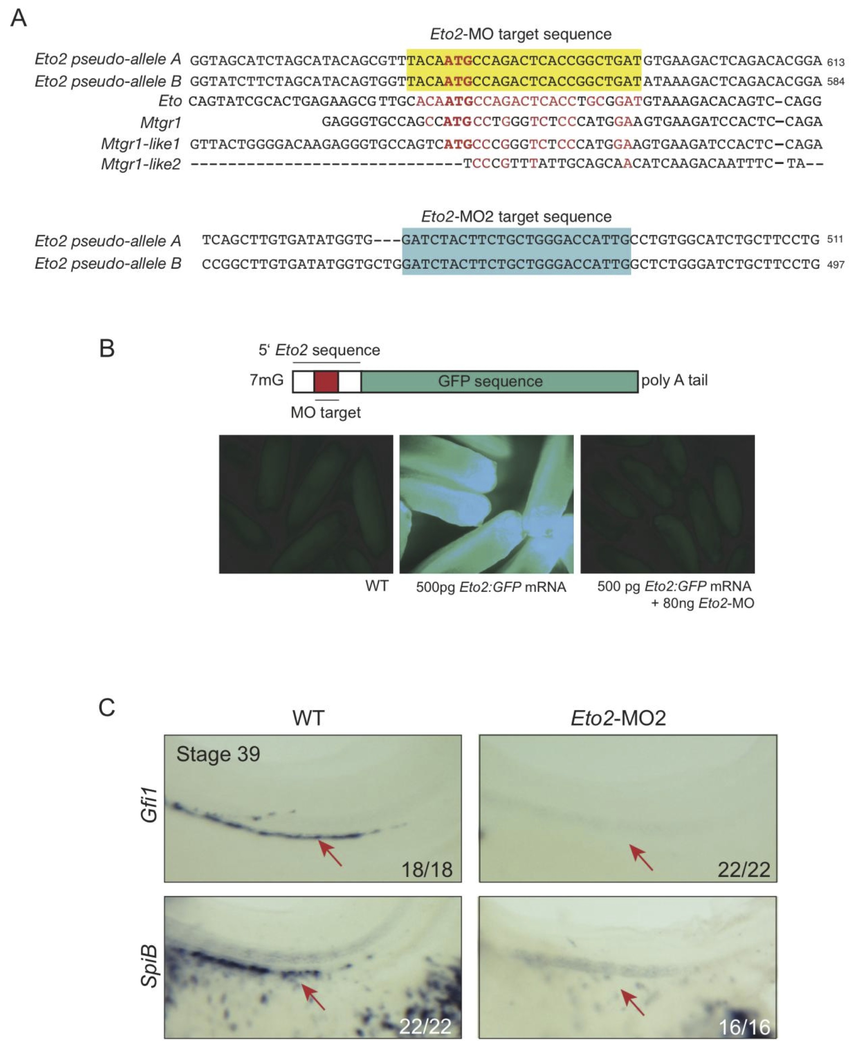 Figure S1, related to Figure 1. Design and testing of the Eto2 morpholinos (MOs) (A) Xenopus laevis has a pseudo-tetraploid genome; genes are therefore present in two �pseudo-allele� forms. Sequence alignment of the beginning of the coding sequence of Eto2 pseudo-alleles A and B and Eto-related genes (top) and of the 5� UTR of Eto2 pseudo-alleles A and B (bottom); the target regions for the �ATG� MO (ETO2-MO) and �5�UTR� MO (ETO2-MO2) are highlighted in yellow and blue respectively. The MOs were designed to have 100% homology to the mRNAs transcribed from both Eto2 pseudo-alleles. The nucleotides in red are conserved between Eto2 and the Eto-related transcripts in the region targeted by Eto2-MO. The Eto-related transcripts (Eto, Mtgr1 and two transcripts with high similarity to Mtgr1, namely Mtgr1-like1 (MGC68858) and Mtgr1-like2 (IMAGE 5156021), accession numbers are in Supplemental Experimental Procedures, section Probes used for in situ hybridisaiton) are not targeted by the Eto2 MOs. For Mtgr1, Mtgr1-like1 and Mtgr1-like2, the sequences targeted by the MOs are sufficiently divergent to avoid unspecific targeting effects. Of note, 5 mismatches are recommended to avoid unspecific targeting effects (Eisen and Smith 2008). Given that only 3 nucleotides differ between the Eto sequence and the sequence recognised by Eto2-MO, the Eto transcripts could potentially be targeted. However, as detailed in Figure S3, they are not expressed in hematopoietic or somitic tissues and are therefore unlikely to have any function in hematopoiesis. The sequences targeted by Eto2-MO2 are too divergent to be aligned; this MO is therefore very unlikely to interfere with translation of any of the Eto-related mRNAs. (B) A GFP-reporter mRNA tethered to the 5� region of ETO2 containing the Eto2-MO target sequence (Eto2:GFP) was used to test the efficacy of the MO in vivo. Embryos co-injected with Eto2-MO and Eto2:GFP mRNA had no visible GFP expression (right panel), as opposed to mRNA alone (middle panel). Eto2-MO is therefore able to bind to its intended target sequence in vivo and to block translation. (C) Expression analysis of the HSC markers Gfi1 and SpiB in Eto2-MO2 injected embryos. Red arrow; DA. Numbers at the bottom of the panels indicate the number of embryos with the given phenotype out of the total number examined. Whole mounts are shown with anterior to the left and dorsal to the top. |