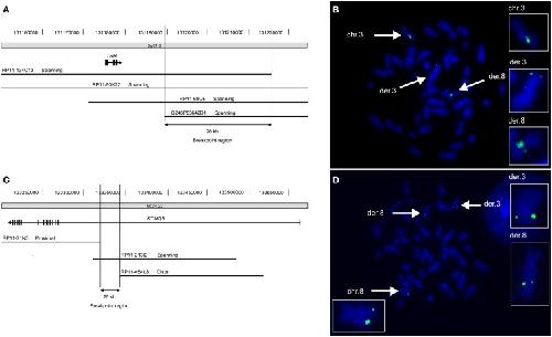 Figure 1. FISH mapping of translocation breakpoints reveals truncated KCNQ3 gene in patient A. (A) Schematic depiction of the 26 kb breakpoint region within chromosomal region 3q21.3 of patient A. The breakpoint region is located 10.5 kb downstream of the TRH gene and contains no genes. (B) Picture showing metaphase chromosomes from patient A (blue) hybridized with the chromosome 3 specific probe RP11-93K22 (green) that spans the breakpoint. The normal chromosome 3 as well as both derivative chromosomes are marked with white arrows and enlarged in the boxes to the right. (C) The 25 kb breakpoint region on chromosome 8 lies within intron 1 of the KCNQ3 gene. (D) The chromosome 8 specific probe RP11-213I2 (green) spans the breakpoint. The normal chromosome 8 as well as the two derivative chromosomes are marked with white arrows and enlarged.