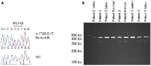 Figure 2. c.1720C > T [p.P574S] variant detected in patient B, C and D. (A) The c.1720 C > T mutation in patient B was identified by Sanger sequencing. (B) The same mutation was identified in patient C and his mother, in patient D and his father and confirmed in patient B and his father by restriction enzyme cleavage of a PCR product encompassing the mutation.