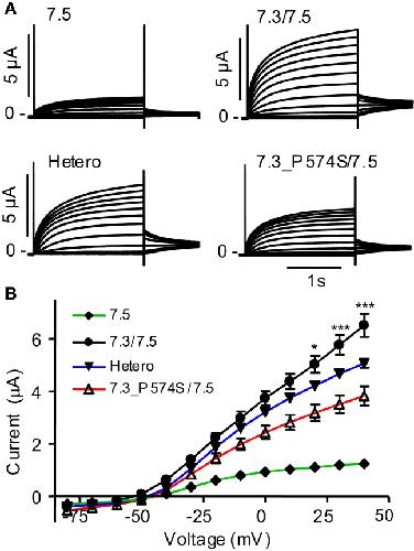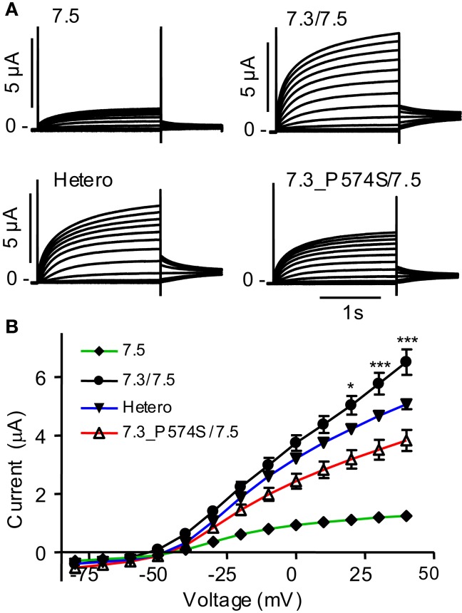 Figure 4. Effect of KV7.3_P574S on KV7.5. KV7.5 was expressed alone (n = 8) or co-expressed with either KV7.3 WT (n = 7), P547S (n = 6), or KV7.5 mixed with KV7.3 WT or KV7.3_P574S (in a 1:1 molar ratio, Hetero, n = 6) in X. laevis oocytes. Currents were activated by voltage-steps from −80 to +40 mV in 10 mV increments. (A) Representative currents are shown. (B) Steady-state current plotted as a function of voltage. Asterisks indicate statistical difference between Hetero and KV7.3/KV7.5. Comparison of the other points were left out for clarity and for voltages higher than 0 mV, all points were statistically different.