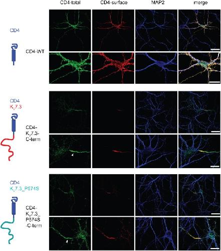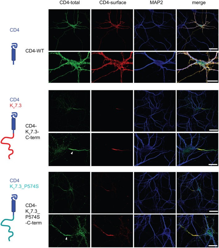 Figure 7. CD4-KV7.3Cterm_P574 can target to the AIS. Confocal images of cultured rat hippocampal neurons (10âDIV) transfected with CD4 (two upper panels), CD4-KV7.3 C-term (two middle panels) and CD4-KV7.3_P574S C-term (two lower panels). The panels to the left illustrate the structure of the chimeric constructs analyzed. CD4-total reflects total CD4 staining in permeabilized cells. CD4-surface is a surface staining of the same cells where the CD4 antibody was applied before permeabilization. The somatodendritic marker MAP2 was included to indicate the location of the AIS (neurite which is MAP2 negative). As expected, CD4 distributes in a non-polarized manner on the surface of axon, soma and dendrites. When the C-terminal of KV7.3 is attached to CD4, the reporter redistributes to the axon initial segment, which illustrates that the KV7.3 C-terminal contains information for AIS localization. The C-terminus of KV7.3_P574S still has the ability to direct CD4 to the AIS. White arrowhead points to the location of the AIS. Scale bars 50 and 20âμm, respectively.