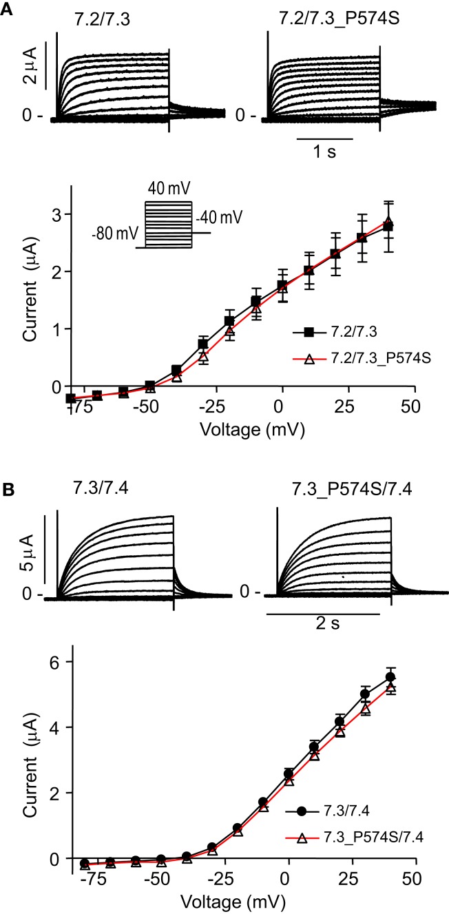 Figure 3. Effect of KV7.3_P574S on KV7.2 and KV7.4 in X. laevis oocytes. Currents were activated by voltage-steps from −80 mV to +40 mV in 10 mV increments. Representative currents are shown as well as steady-state current plotted as a function of voltage. (A) KV7.2 was co-expressed with either KV7.3 WT (n = 6) or P574S (n = 5). (B) Effect of KV7.3_P574S on KV7.4. KV7.4 was co-expressed with either KV7.3 WT (n = 10) or P574S (n = 13) in X. laevis oocytes.