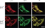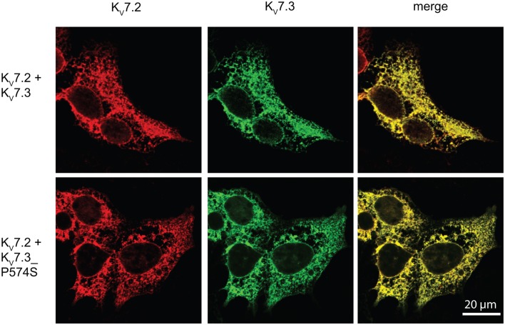 Figure 5. No effect of KV7.3_P574S on localization of the KV7.2/KV7.3 complex in HEK 293 cells. KV7.2 was transiently expressed in HEK 293 cells together with KV7.3 WT or KV7.3_P574S, and the localization of the complex was analyzed by immunocytochemistry and confocal microscopy. As illustrated, the P574S mutation is without effect on the localization of the complex that displays a primarily intracellular localization pattern. Scale bar 20 μm.