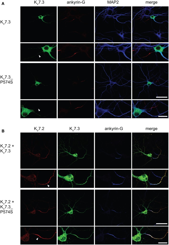 Figure 6. KV7.2/KV7.3_P574 complexes still target to the AIS of cultured hippocampal neurons. Confocal images of cultured rat hippocampal neurons (10 DIV) expressing KV7.3 WT or KV7.3_P574S (A) and co-transfected with KV7.2 (B). (A) KV7.3 is primarily intracellularly expressed when expressed on its own. No significant KV7.3 expression is observed at the AIS. (B) When co-expressing KV7.3 with KV7.2, both channel subunits are observed at the AIS. KV7.3_P574S displays the same localization characteristics. White arrowhead points to the location of the AIS. Ankyrin-G: marker of the axon initial segment, MAP2: marker of the somatodendritic region of neurons. Scale bars 50 and 20 μm, respectively.