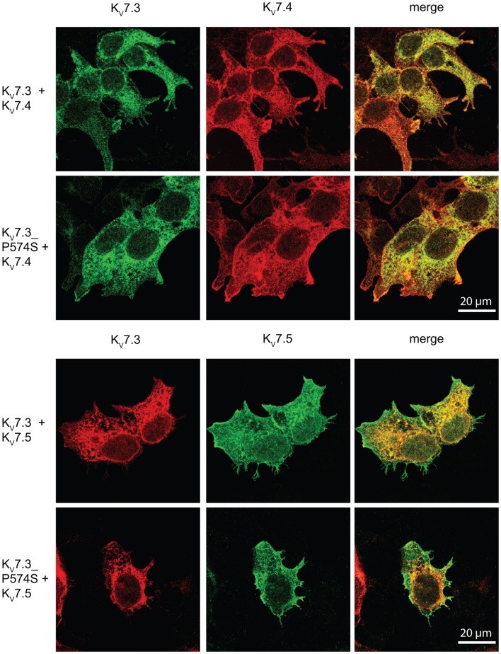 Figure 8. No effect of KV7.3_P574S on the localization of KV7.4 and KV7.5 containing complexes in HEK 293 cells. KV7.4 and KV7.5 were transiently expressed in HEK 293 cells together with KV7.3 or KV7.3_P574S and the localization of the expressed subunits analyzed by immunocytochemistry and confocal microscopy. As illustrated, the P574S mutation is without effect on the localization pattern of the complexes that displays a mixed surface and intracellular staining pattern. Scale bar 20 μm.