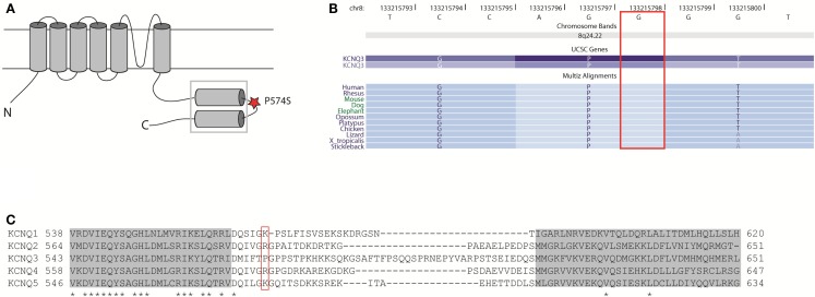 Figure 9. Localization and conservation of the SNP c.1720C > T [p.P574S] in KCNQ3. (A) The KV7 subunits consist of six transmembrane domains and a long intracellular carboxy-terminal that contains the subunit interaction domain (sid) (within the square). The P574 amino acid is located in the linker region between two coiled-coil regions. Adapted from (Wehling et al., 2007). (B) The c.1720C nucleotide is conserved between species. Adapted from the UCSC genome browser hg18. (C) Amino acid alignment of the si domains from all KV7 channels. The two coiled-coil domains are depicted as gray boxes and conserved amino acids are marked with an asterisk. The P574 amino acid is located in the linker region between two coiled-coil regions and is not conserved between KV7 members. Adapted from Wehling et al. (2007).