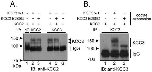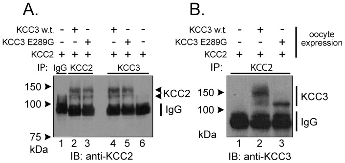 Figure 2. Co-immunoprecipitation reveals interaction between KCC3 and KCC2.Xenopus laevis oocytes were injected with KCC2 cRNA in the presence or absence of wild-type KCC3 or KCC3-E289G cRNAs. KCC2 or KCC3 were then immunoprecipitated and the complex was analyzed by Western blot analysis using rabbit polyclonal anti-KCC2 or anti-KCC3 antibodies. Immunodetection of KCC2, KCC3 and IgG are indicated on the right of the panels. Note that both KCC2 (panel A) and KCC3 (panel B) when immunoprecipitated are observed as 2 bands: unglycosylated and glycosylated forms. Experiment was repeated once and yielded similar data.