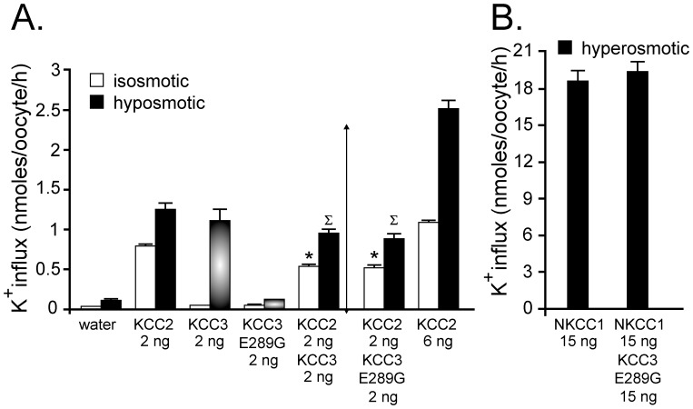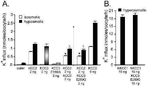 Figure 3. Evidence for dominant-negative effect of KCC3 on KCC2 function.A) Xenopus laevis oocytes were injected with KCC2 cRNA in the presence or absence of wild-type KCC3 or KCC3-E289G cRNAs. Three days following injection, K+ influx was measured under isosmotic conditions where only KCC2 function is active, or under hyposmotic conditions where both KCC2 and KCC3 function are stimulated. Bars represent mean ± S.E.M. (n = 20–25 oocytes). Flux is expressed in nmoles K+/oocyte/h. (*) P<0.01 (ANOVA) compared with KCC2 alone under isosmotic condition, (∑) P<0.01 (ANOVA) compared with KCC2 alone under hyposmotic solution. Arrow indicates the anticipated flux mediated by the combined activity of KCC2 and KCC3. This is a representative experiment. Each condition (bar) was reproduced multiple times. B) K+ influx was measured under hyperosmotic conditions in oocytes injected with NKCC1 cRNA in the presence or absence of KCC3-E289G cRNA. Bars represent mean ± S.E.M. (n = 20–25 oocytes). Flux is also expressed in nmoles K+/oocyte/h.