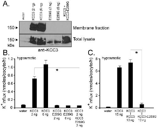 Figure 5. Evidence for dominant-negative effect of KCC3 on KCC2 trafficking and function.Xenopus laevis oocytes were injected with KCC3, KCC3-E289G, or both. A) Membrane fraction was isolated using a silica based cross-linking method and membrane proteins and whole oocyte lysates were subjected to Western blot analysis using rabbit polyclonal anti-KCC2 or anti-KCC3 antibodies. B) K+ influx was measured under hyposmotic conditions. C) K+ influx generated by KCC3-KCC3 and KCC3-KCC3-E289G concatamers. Bars represent mean ± S.E.M. (n = 20–25 oocytes). Flux is expressed in nmoles K+/oocyte/h. *P<0.001 (ANOVA) compared with KCC3 controls. Experiment was performed 6 times with similar data.