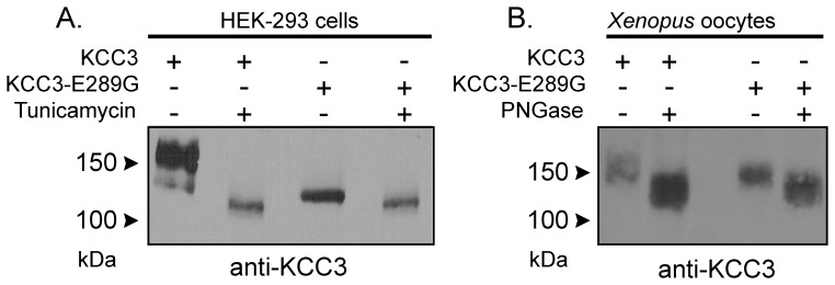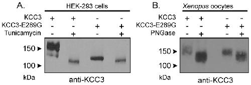 Figure 7. N-Glycolsylation deficiency of the KCC3-E289G mutant.A) Western blot analysis of wild-type KCC3 and KCC3-E289G mutant in HEK 293FT cells treated with tunicamycin (10 µg/ml for 18 h). B) Western blot analysis of wild-type KCC3 and KCC3-E289G mutant proteins isolated from Xenopus laevis oocytes and treated with PNGase (0.25U, 12 h at 37°C). The membranes were exposed to a rabbit polyclonal anti-KCC3 antibody. The experiment was repeated once with identical data.