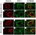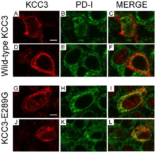 Figure 8. Evidence for KCC3-E289G localizing in the endoplasmic reticulum.HEK 293FT cells were transfected with wild-type KCC3 (A–F) or KCC3-E289G mutant (G–L). Two days post- transfection, the cells were fixed with paraformaldehyde, treated with saponin, and exposed to rabbit polyclonal anti-KCC3 and mouse monoclonal anti-PDI antibodies followed by cy3-conjugated anti-rabbit and Alexa Fluor–conjugated goat anti-mouse antibodies. Focal plane images of KCC3 signal (A, D, J, G), ER marker signal (B, E, H, K), and combined signals (C, F, I, L). Bar = 5 µm.
