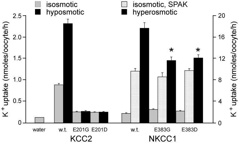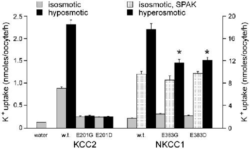 Figure 10. Effect of E289G-like mutations in KCC2 and NKCC1.K+ influx was measured through unidirectional 86Rb tracer uptake in oocytes injected with water, wild-type KCC2 or KCC2-E201G or KCC2-E201D mutant cRNAs, and wild-type or NKCC1-E383G or NKCC1-E383D mutant cRNAs. Uptakes were measured under isosmotic (200 mOsM) and hypotonic (100 mOsM) solutions for KCC2 and under isotonic and hypertonic (265 mOsM) solutions for NKCC1. Bars represent means±SEM (n = 20–25 oocytes). Fluxes are expressed in nmoles K+/oocyte/h. (*) Denotes statistical significance with P<0.001 (ANOVA followed by Tukey-Kramer Multiple Comparisons Test). Experiment was done once.