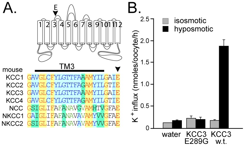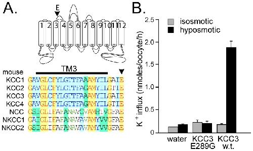 Figure 1. Absence of function of KCC3-E289G mutant cDNA.A) Conservation of glutamic acid residue (E289 in mouse KCC3) within mouse SLC12A cotransporters. The residue, highlighted by an arrowhead in cartoon and sequence alignment, is localized at the end or right downstream of transmembrane domain 3 (TM3). B) K+ influx was measured through unidirectional 86Rb tracer uptake under isosmotic and hyposmotic conditions, in oocytes injected with water, KCC3-E289G mutant cRNA, and wild-type KCC3 cRNA. Bars represent means±SEM (nâ=â25 oocytes).