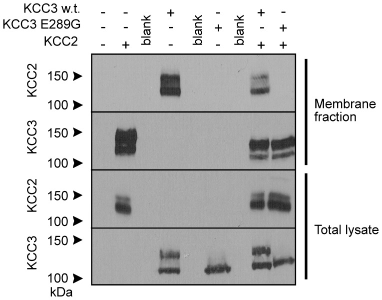Figure 4. Evidence for dominant-negative effect of KCC3 on KCC2 trafficking.Xenopus laevis oocytes were injected with KCC2 in the presence or absence of wild-type KCC3 or KCC3-E289G cRNAs and membrane fractions were isolated using a silica cross-linking method. Membrane proteins and whole oocyte lysates were subjected to Western blot analysis using rabbit polyclonal anti-KCC2 or anti-KCC3 antibodies. Experiment was reproduced 3 times.