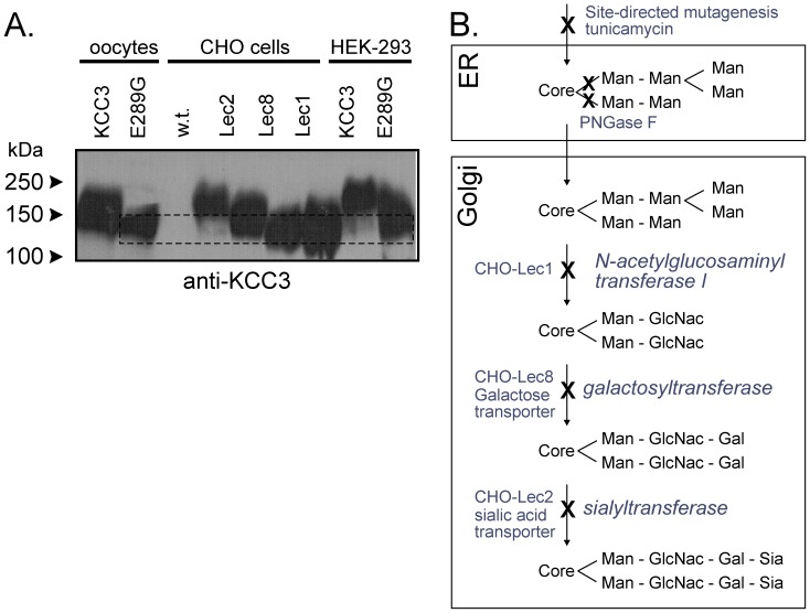 Figure 6. N-Glycolsylation deficiency of the KCC3-E289G mutant.A) Western blot analyses of KCC3-E289G mutant in HEK 293FT cells and Xenopus laevis oocytes compared to wild-type KCC3 in HEK 293FT cells, wild-type and mutant CHO cells, and Xenopus laevis oocytes, using rabbit polyclonal anti-KCC3 antibody. CHO-Lec1 cells have mutation in N-acetylglucosaminyl transferase, whereas CHO-Lec8 and CHO-Lec2 have deficient galactose and sialic acid transporters, respectively. Two independent experiments are shown. Experiment was performed 4 times. B) Scheme represents the main steps in N-linked oligosaccharide biosynthetic pathway. First, core Glc-Nac-Glc-Nac-Man with branched mannose residues are added to the Asparagines in the ER. In the Golgi, mannose molecules are replaced by acethylglucosamyl groups, followed by the addition of galactose and sialic acid groups. These steps require the availability of galactose and sialic acid in the cells, which is prevented in the mutant CHO cells by elimination of specific transporters.