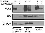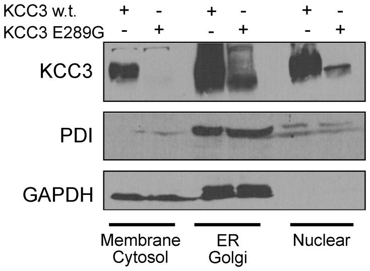 Figure 9. Sub-cellular localization of KCC3 and KCC3-E289G in HEK 293FT cells.HEK 293FT cells were transfected with wild-type KCC3 or KCC3-E289G mutant. Two days post-transfection, the cells were treated with digitonin to extract proteins from cholesterol-rich (plasma) membranes (membrane/cytosol fraction), followed by NP40 treatment to isolate proteins from ER/Golgi fraction, followed by deoxycholate+SDS detergents to isolate proteins from nuclear fraction. Western blots were probed with rabbit polyclonal anti-KCC3 and mouse monoclonal anti-PDI and anti-GAPDH antibodies. Experiment was reproduced at least 5 times with similar data.
