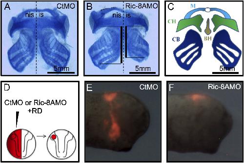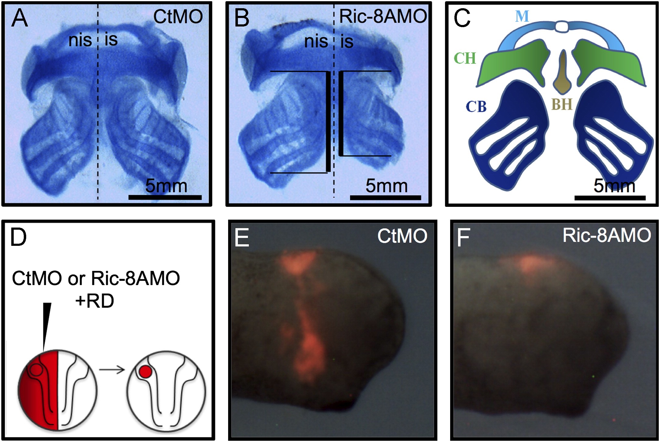 Fig. 2. Ric-8A function displays a cell-autonomous behavior and is required for proper craniofacial development in Xenopus embryos. (A) Ventral view showing cartilage of a stage 42 embryo injected with the control morpholino (CtMO). (B) Ventral view showing cartilage of a stage 42 embryo injected with the Ric-8AMO. (C) Schematic drawing of the ventral cartilaginous elements of a normal tadpole. The embryo images are representative of three independent experiments analyzing 30 embryos injected for each condition analyzed. Abbreviations: nis, non-injected side; is, injected side; Ir, infrarostralcartilage; M, Meckel cartilage; CH, ceratohyalcartilage; CB, ceratobranchial cartilage and BH, basihyalcartilage. (D) Schematic drawing of the transplantation procedure used to assess cranial NC migration in vivo. (E) Cranial NC cells transplanted from embryos co-injected with the CtMO and rhodamine dextran (RD) display a normal migratory pattern. (F) Cranial NC cells transplanted from embryos co-injected with the Ric-8AMO and RD remain in the dorsal region of the embryo. The embryo images are representative of two independent experiments analyzing 15 embryos injected for each condition analyzed.