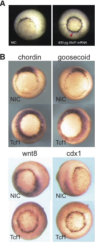 Fig. 1 (left). Overexpression of tcf1 induces a dorsalized phe- notype in Xenopus embryos. (A) Xenopus tropicalis embryos overexpressing tcf1 display premature mesodermal involution. Stage 10.5 embryos, marginally injected in both blastomeres at the two-cell stage with 180 pg of tcf1 RNA, show premature mesodermal involution around the entire marginal zone (81%, n=62; red arrowhead, ventral). (B) Overexpression of tcf1 induces dorsalization. Expression of chordin (83%, n=58) and goosecoid (83%, n=59) has expanded all around the blastophore in Xenopus laevis embryos injected with tcf1 RNA, while expression of wnt8 (73%, n=64) and cdx1 (89%, n=55) is lost.