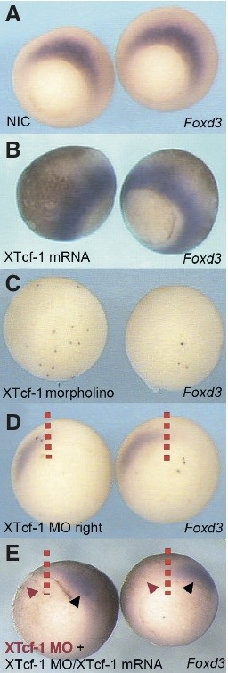 Fig. 2 (right).Tcf1 regulates the expression of foxd3 in the early mesoderm. (A) Endogenous expression of foxd3 at the dorsal blastoporus lip. (B) Injection of tcf1 RNA in each blastomere (total of 400 pg) in two-cell stage Xenopus laevis embryos leads to the expression of foxd3 all around the blastopore (75%, n=61). (C) Injection of 10 ng of tcf1 morpholino (MO) in both blastomeres at the two-cell stage abrogates foxd3 expression in Xenopus laevis (50%, n=86). (D) Unilateral injection of tcf1 MO (rightblastomere) at the two-cell stage inhibits foxd3 expression only on the injected side (51%, n=84). (E) Coinjection of Xtltcf1 RNA (rightblastomere) with tcf1 MO (both blastomeres) rescues foxd3 expression (rightblastomere) in Xenopus laevis; left side is indicated by a red arrow- head, right side is indicated by a black arrowhead. (NIC, non-injected stage 10.5 control embryo).