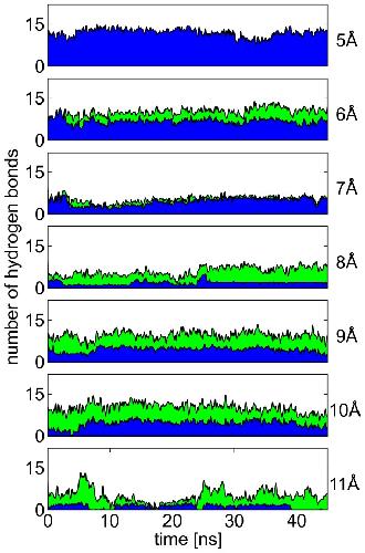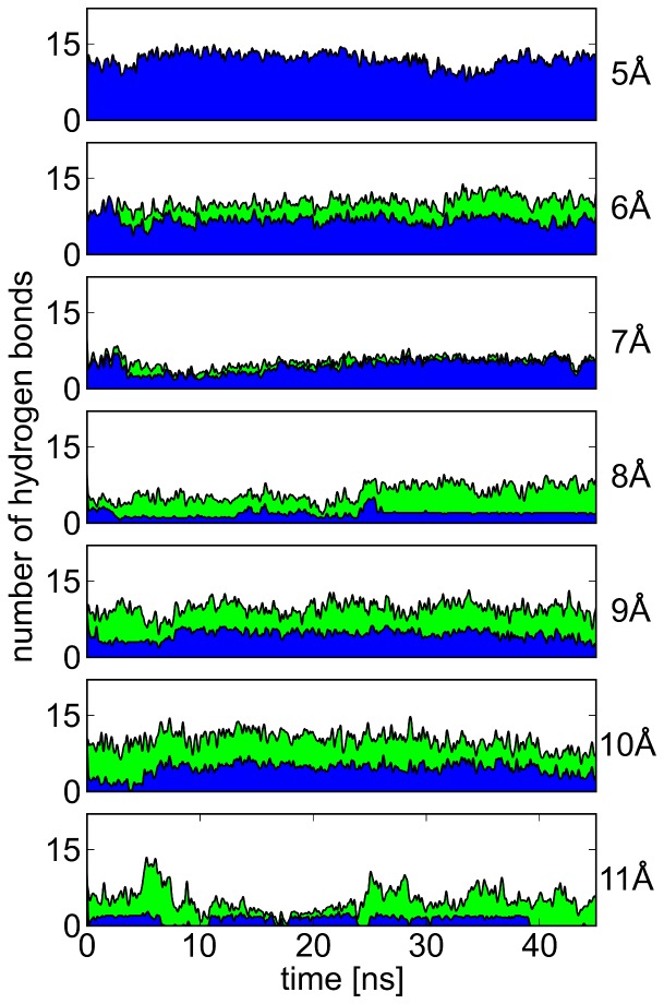Figure 3. Hydrogen bonds formed by N629 at different S620–N629 distances.For each S620–N629 C distance (right), the number of hydrogen bonds formed by the N629 side-chain to the same subunit (blue area, mainly S620) and to neighboring subunits (green area, mainly G628) is shown over simulation time. A steady rise in the proportion of inter-subunit hydrogen bonds can be seen with an increase in S-N distance.